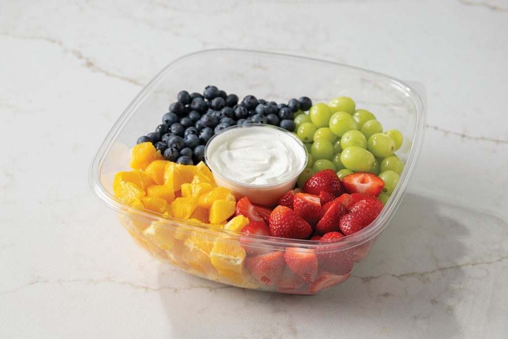 Catering Menu / Breakfast / Fruit BowlFruit Bowl Orange, strawberries, green grapes, and blueberries. Served with a side of soft cream for dipping. Serves: 12 Contains: Milk 160 Calories per serving