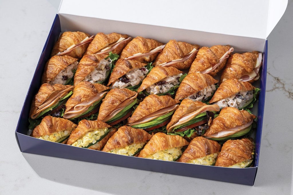 An assortment of classic lunch sandwiches on mini croissants! The selection includes Mini Ham & Cheese Croissant, Mini Turkey & Avocado Croissant, Mini Chicken Salad Croissant, and Mini Egg Salad Croissant.