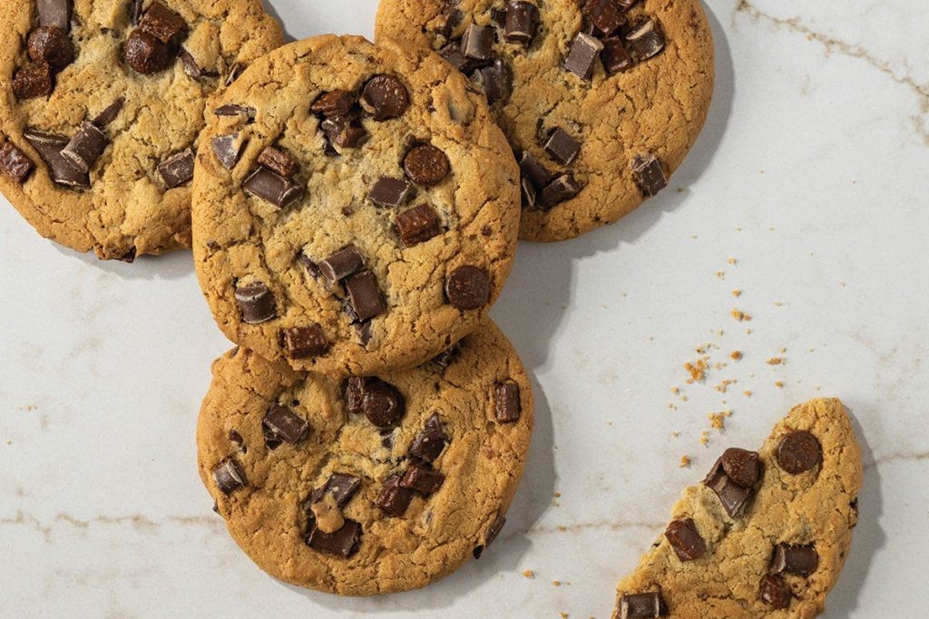 Menu / À emporter / Biscuit aux triples pépites de chocolatBiscuit aux triples pépites de chocolat Biscuit moelleux et moelleux chargé de pépites de chocolat. Contient : Oeuf, Lait, Soya, Blé 530 Calories par portion
