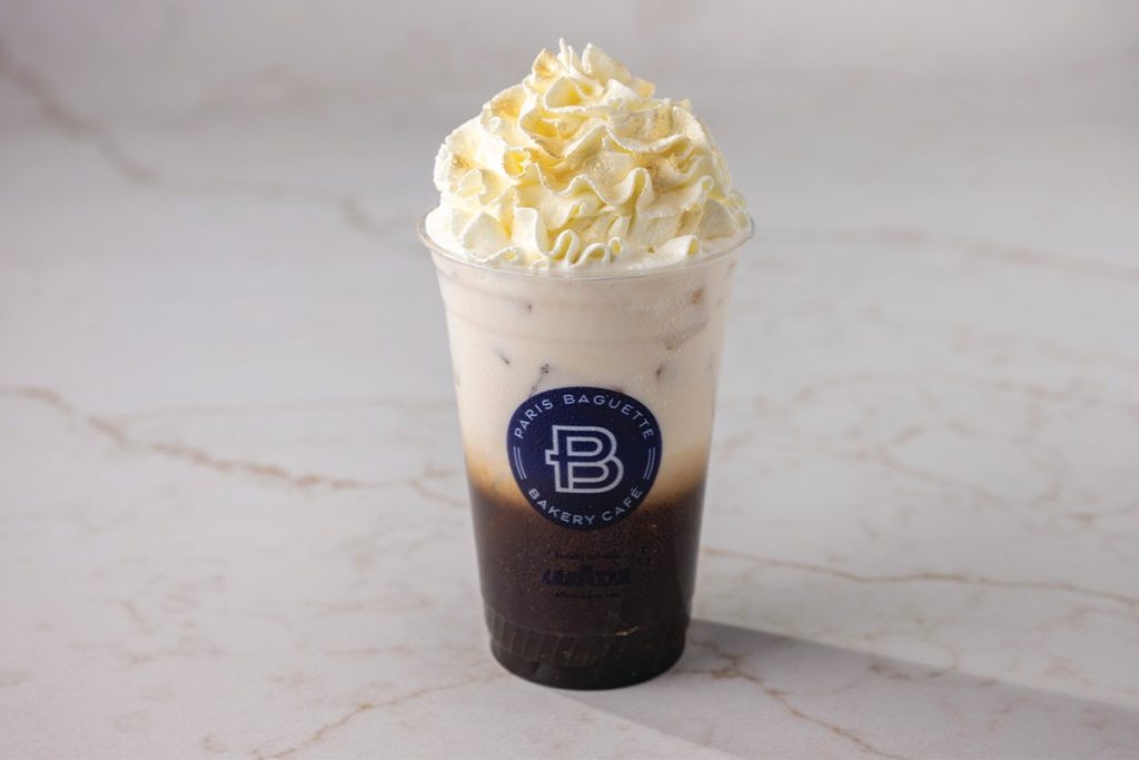 Menu / Seasonal Sips / Iced Irish Cream LatteIced Irish Cream Latte Rich espresso swirled with Irish Cream and milk over ice; topped with whipped cream and dusted with edible gold. Contains: Milk 390 Calories per serving