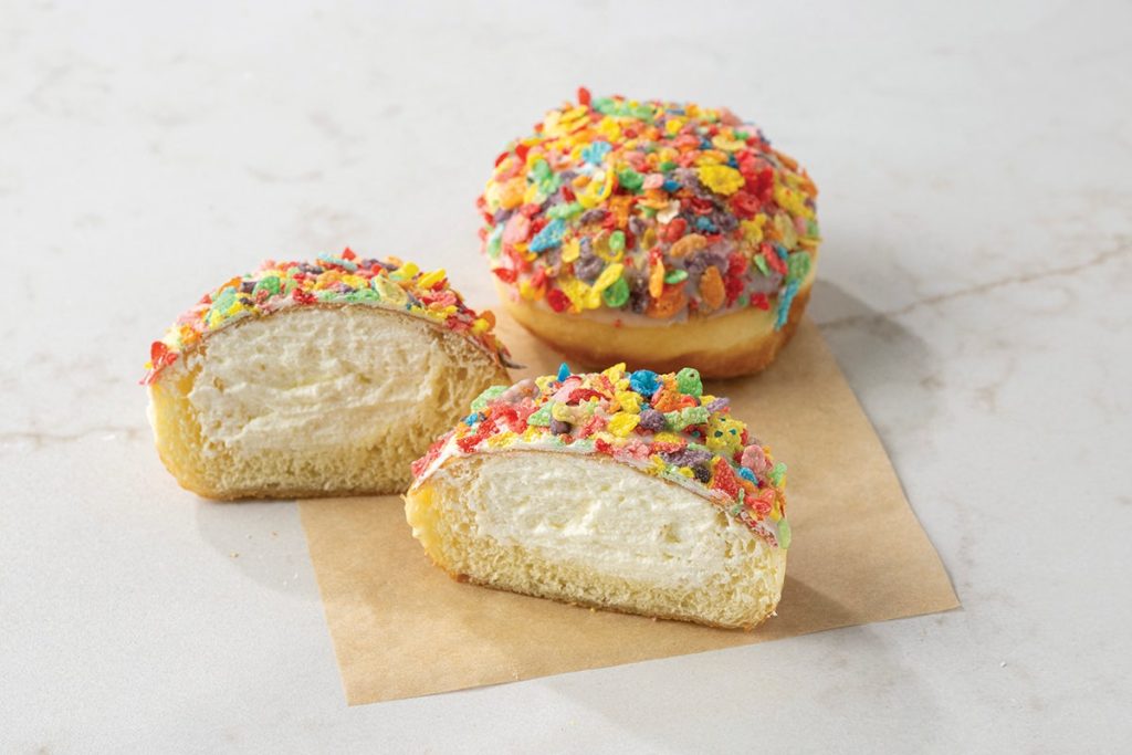 Menu / Seasonal Sweets / Milk & Cereal King Cream DonutMilk & Cereal King Cream Donut King cream donut filled with milk cream, iced in white chocolate; topped in crunchy fruit cereal. Contains: Egg, Milk, Soy, Wheat 440 Calories per serving