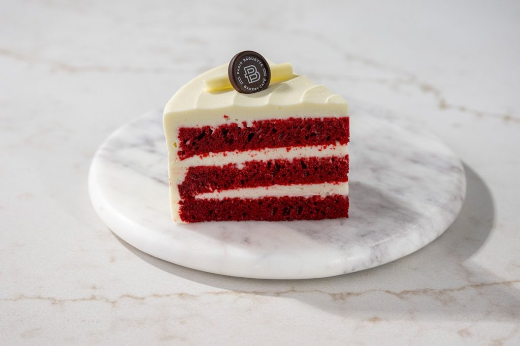 Menu / Cake Slices & Tarts / Red Velvet Cake SliceRed Velvet Cake Slice Three layers of red velvet sponge cake filled with cream cheese icing, topped with a white chocolate curl Contains: Egg, Milk, Soy, Wheat 590 Calories per serving